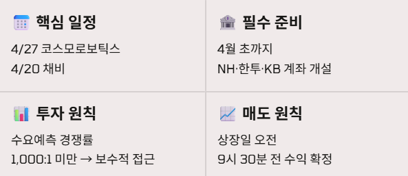 | 코스모로보틱스 | 4/27~28 (지연됨) | 유진,유안타,NH투자증권 | 미정(청약 후 약 2주 후 예상) |