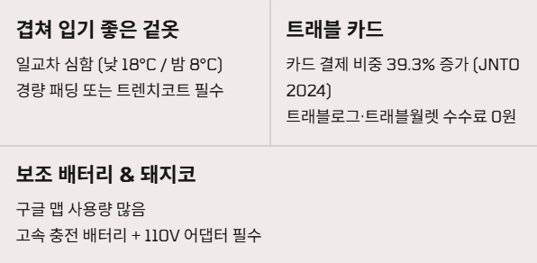 - 보조 배터리 & 돼지코: 구글 맵 사용량이 많으므로 고속 충전 배터리와 110V 어댑터를 꼭 챙기세요.