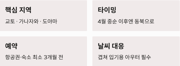 - 가나자와 (Kanazawa): 최근 '제2의 교토'로 불리며 급부상 중인 지역입니다. 호쿠리쿠 신칸센 연장 개통으로 접근성이 좋아졌으며, 겐로쿠엔의 벚꽃은 4월 중순까지도 절경을 이룹니다.