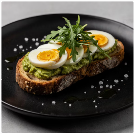 - 재료: 저탄수화물 통곡물 빵 1장, 아보카도 1/2개, 삶은 계란 1개, 루꼴라 또는 어린잎 채소, 올리브 오일, 소금, 후추