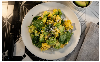 - 조리법: 프라이팬에 버터를 녹이고 계란 스크램블을 만듭니다. 마지막에 손질한 시금치와 깍둑썰기 한 아보카도를 넣어 살짝 섞은 후 소금, 후추로 간하면 끝!