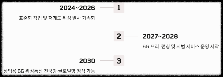 - 2030년: 상업용 6G 위성통신 전국망/글로벌망 가동