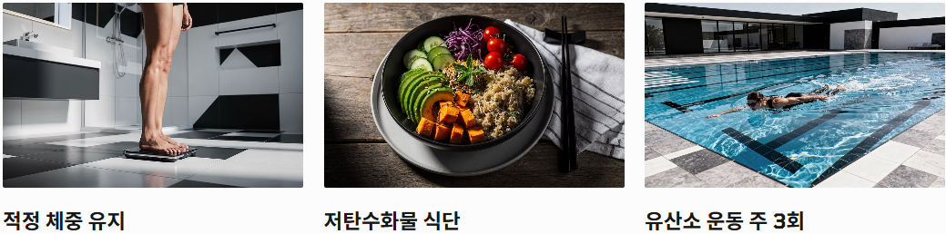 - 저탄수화물 식단: 설탕, 액상과당, 흰쌀밥 대신 통곡물과 채소 위주로 드세요.