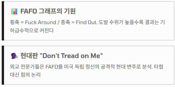외교 전문가들은 FAFO를 과거의 "Don't Tread on Me(나를 밟지 마라)"의 현대적이고 공격적인 변주로 보고 있습니다. 타협보다는 힘의 논리를 우선시하는 시대 정신이 반영된 셈이죠.