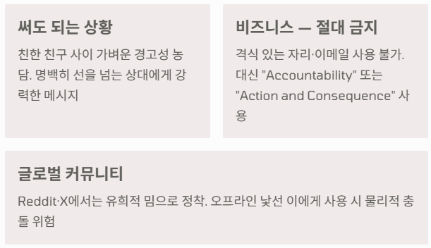 - 비즈니스 환경에서의 주의: 'Fuck'이라는 단어가 포함되어 있으므로 격식 있는 자리나 이메일에서는 절대 사용해서는 안 됩니다. 대신 "Action and Consequence" 혹은 "Accountability"라는 표현을 사용하는 것이 매너입니다.